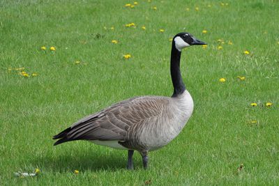 Canada Geese pair for life and travel in family or larger groups. Families will raise four to eight young a year, and by two months the young are hard to tell from adults. When feeding, one will stand guard while the others eat. They can be somewhat aggressive and hiss at walkers on a sidewalk; it is best to give them some space when they are acting this way. They are generally herbivores, eating grain left in harvested fields in the fall, wheat in the spring, and new sprouts or mowed grass whenever available.